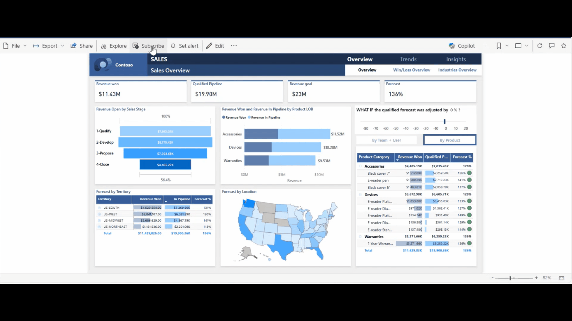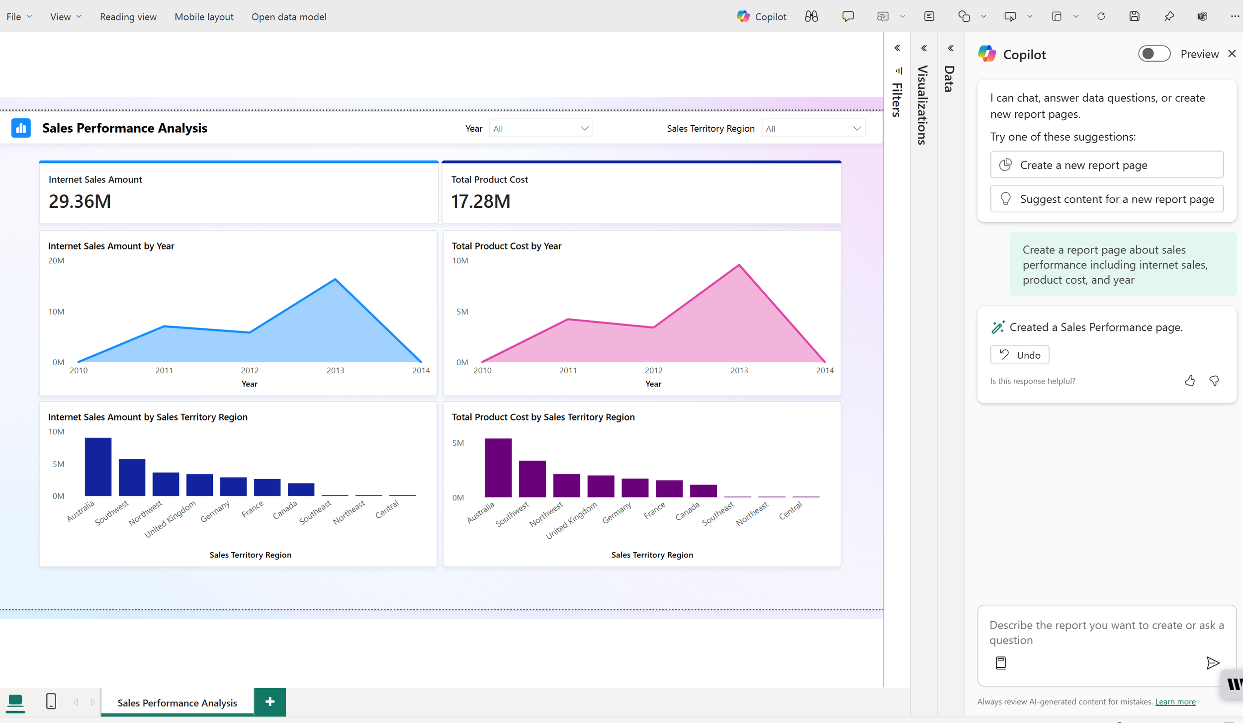 Få Copilot til at lave præcis de rapporter, du har brug for gennem naturligt sprog – lav f.eks. en prompt med ordlyden: ”Opret en side, hvor jeg kan analysere salgsbeløb, omsætning og avance for vores produkter, kategorier og underkategorier over tid og på tværs af regioner.”.
