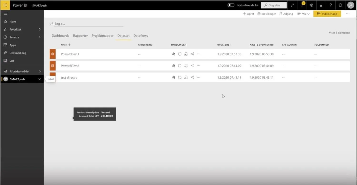 Når felterne og strukturen er lavet i Business Central, kræver det kun et par klik få SMARTpush til at overføre datatabellen til Power BI.
